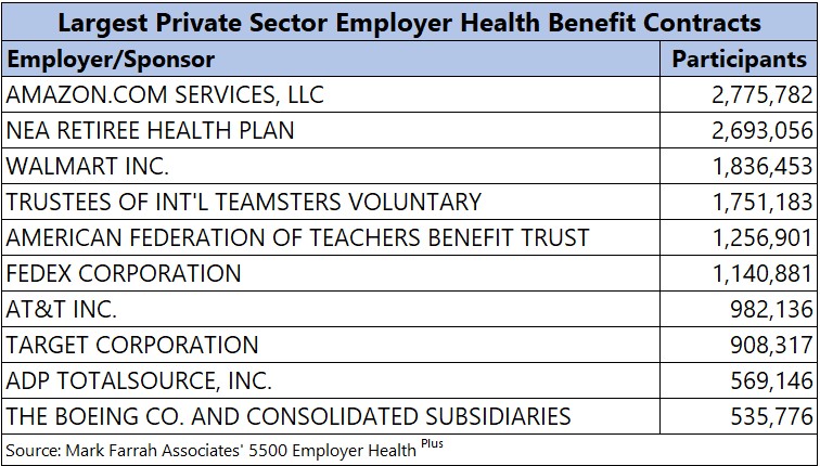 In their most recent filings, more than 94,000 private-sector employers reported that they offer some type of health benefit subject to ERISA[i] guidelines. These companies collectively make health benefits available to a universe of about 95 million participants.[ii] The following table presents private-sector employers that reported more than 500,000 potential plan participants across the spectrum of health benefit contracts. Online retail giant Amazon took the top position, surpassing the NEA (National Education Association) Retiree Health Plan, a professional organization representing teachers and public-school personnel across the nation. Walmart maintained its position in third. The remaining top positions are held either by unions, such as the International Brotherhood of Teamsters or the American Federation of Teachers, or globally operated companies, such as FedEx, AT&T, and ADP, one of many professional employer organizations (PEO) with a significant presence in the market.